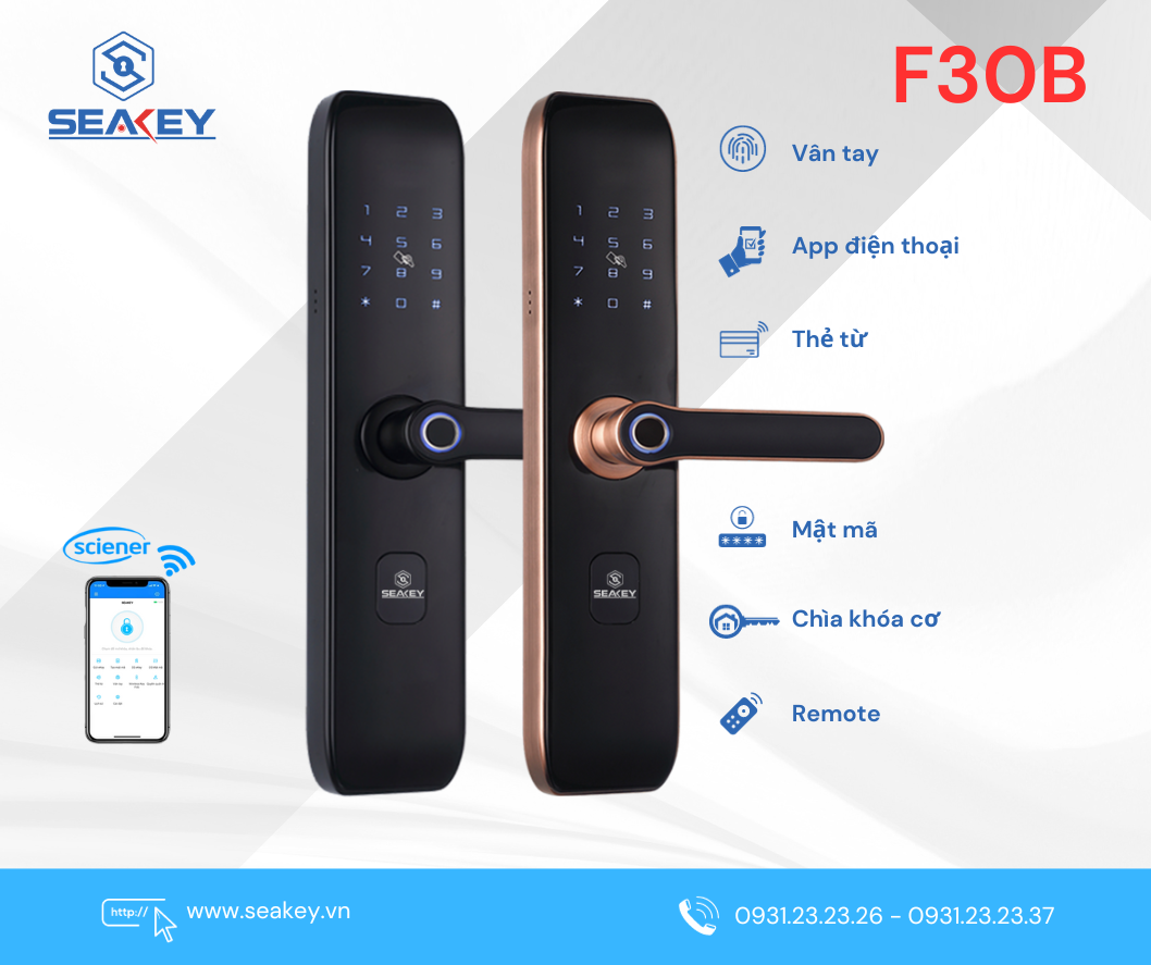 Khóa vân tay Seakey F30B là dòng khoá cửa điện tử sử dụng cho cửa gỗ , cửa sắt đố cửa nhỏ, cửa thông phòng với 6 tính năng mở khoá hiện đại: App, vân tay, mã số, thẻ từ, chìa khóa cơ chống sao chép và remote (tùy chọn mua thêm)