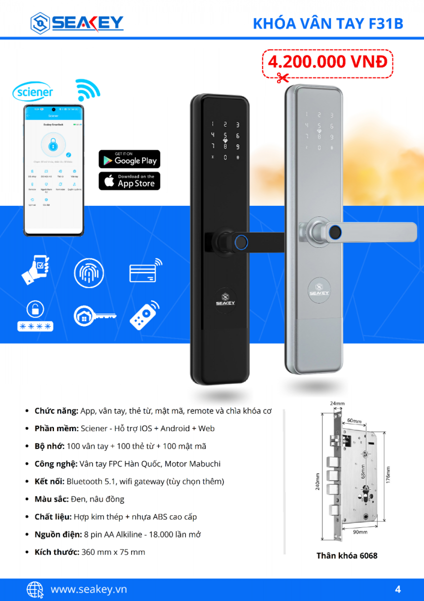 Khóa vân tay Seakey F31B là dòng khoá cửa điện tử sử dụng cho cửa gỗ , cửa sắt đố cửa nhỏ, cửa thông phòng với 6 tính năng mở khoá hiện đại: App, vân tay, mã số, thẻ từ, chìa khóa cơ chống sao chép và remote (tùy chọn mua thêm)