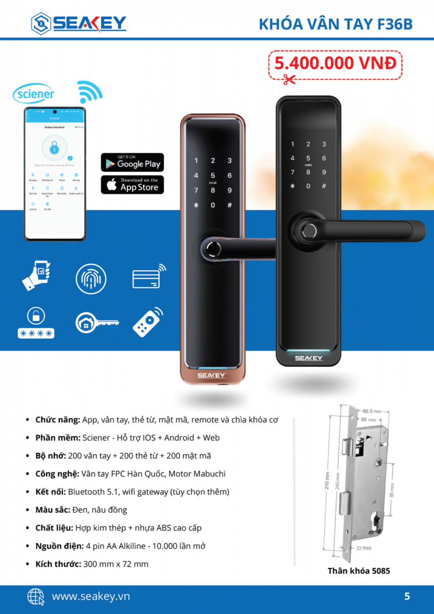 Khóa vân tay Seakey F36B là dòng khoá cửa điện tử sử dụng cho cửa gỗ , cửa sắt đố cửa nhỏ, cửa thông phòng với 6 tính năng mở khoá hiện đại: App, vân tay, mã số, thẻ từ, chìa khóa cơ chống sao chép và remote (tùy chọn mua thêm)