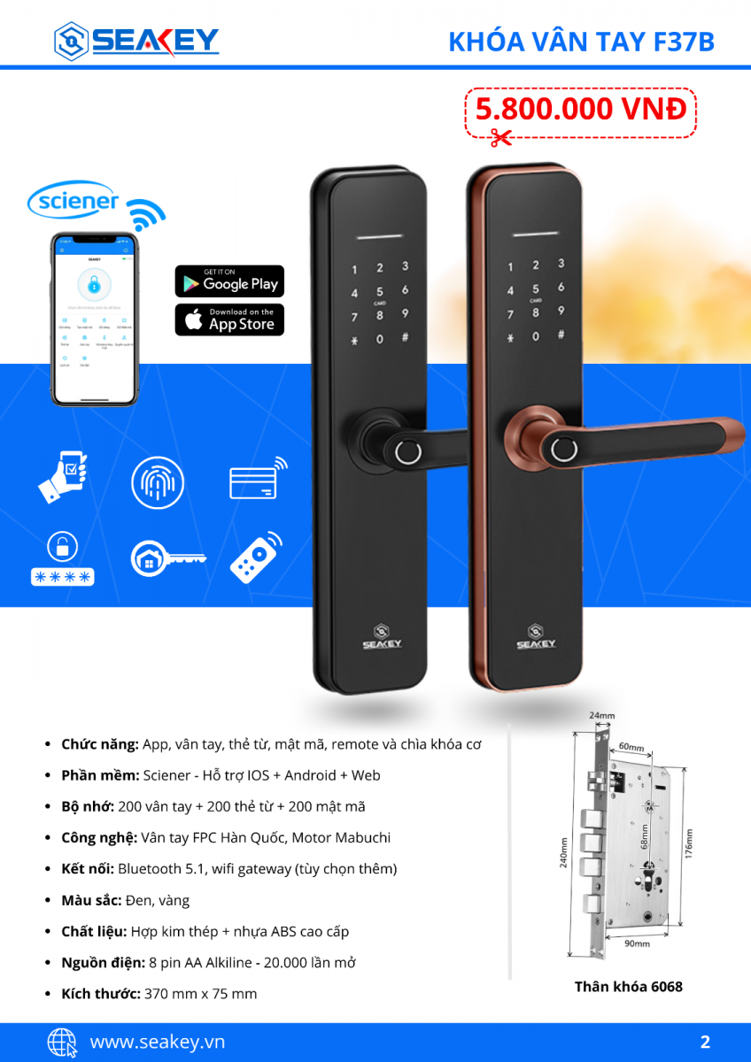 Khóa vân tay Seakey F37B là dòng khoá cửa điện tử sử dụng cho cửa gỗ , cửa sắt đố cửa nhỏ, cửa thông phòng với 6 tính năng mở khoá hiện đại: App, vân tay, mã số, thẻ từ, chìa khóa cơ chống sao chép và remote (tùy chọn mua thêm)