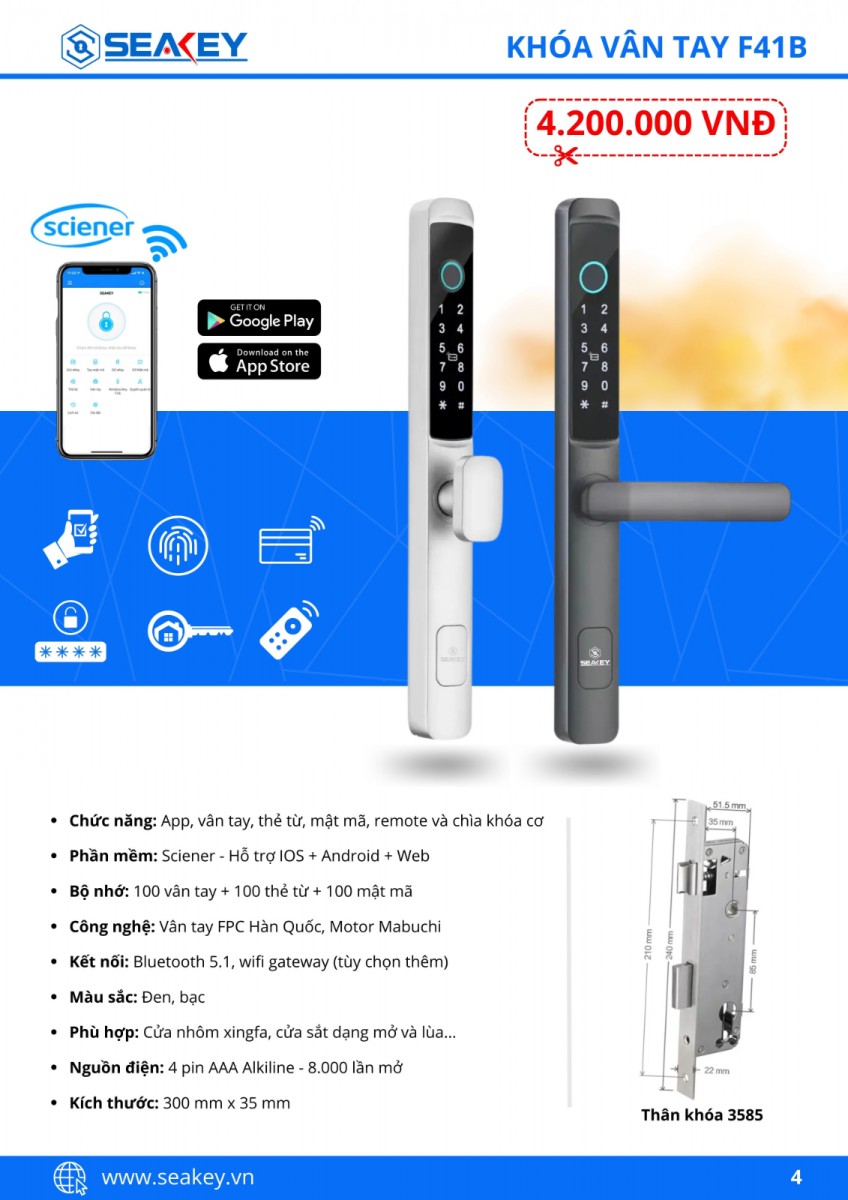 Khóa vân tay Seakey F41B là dòng khoá cửa điện tử sử dụng cho cửa gỗ , cửa sắt đố cửa nhỏ, cửa thông phòng với 6 tính năng mở khoá hiện đại: App, vân tay, mã số, thẻ từ, chìa khóa cơ chống sao chép và remote (tùy chọn mua thêm)